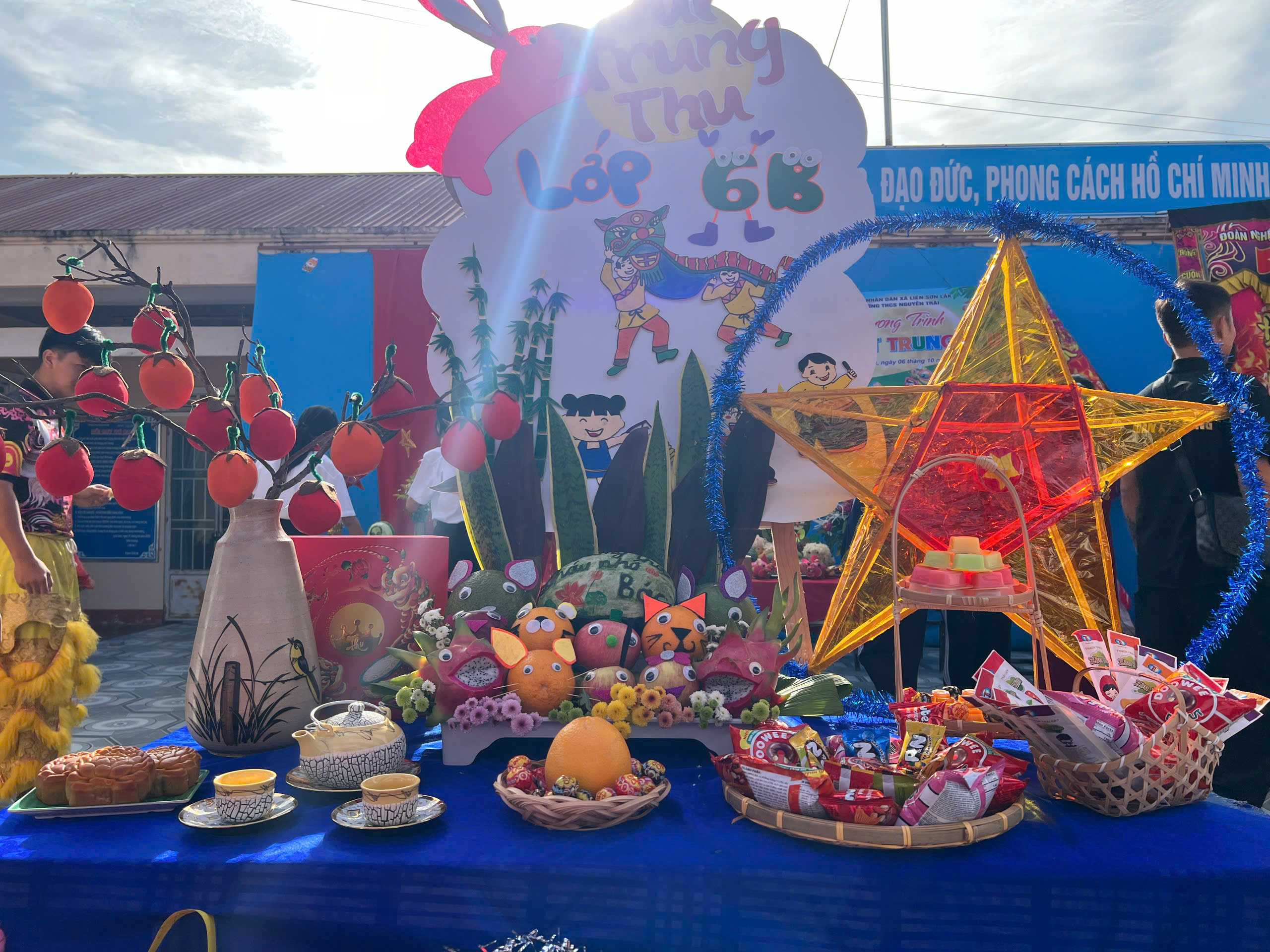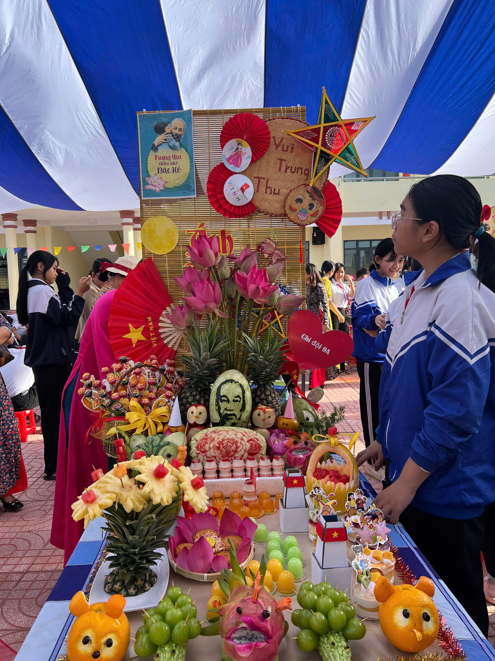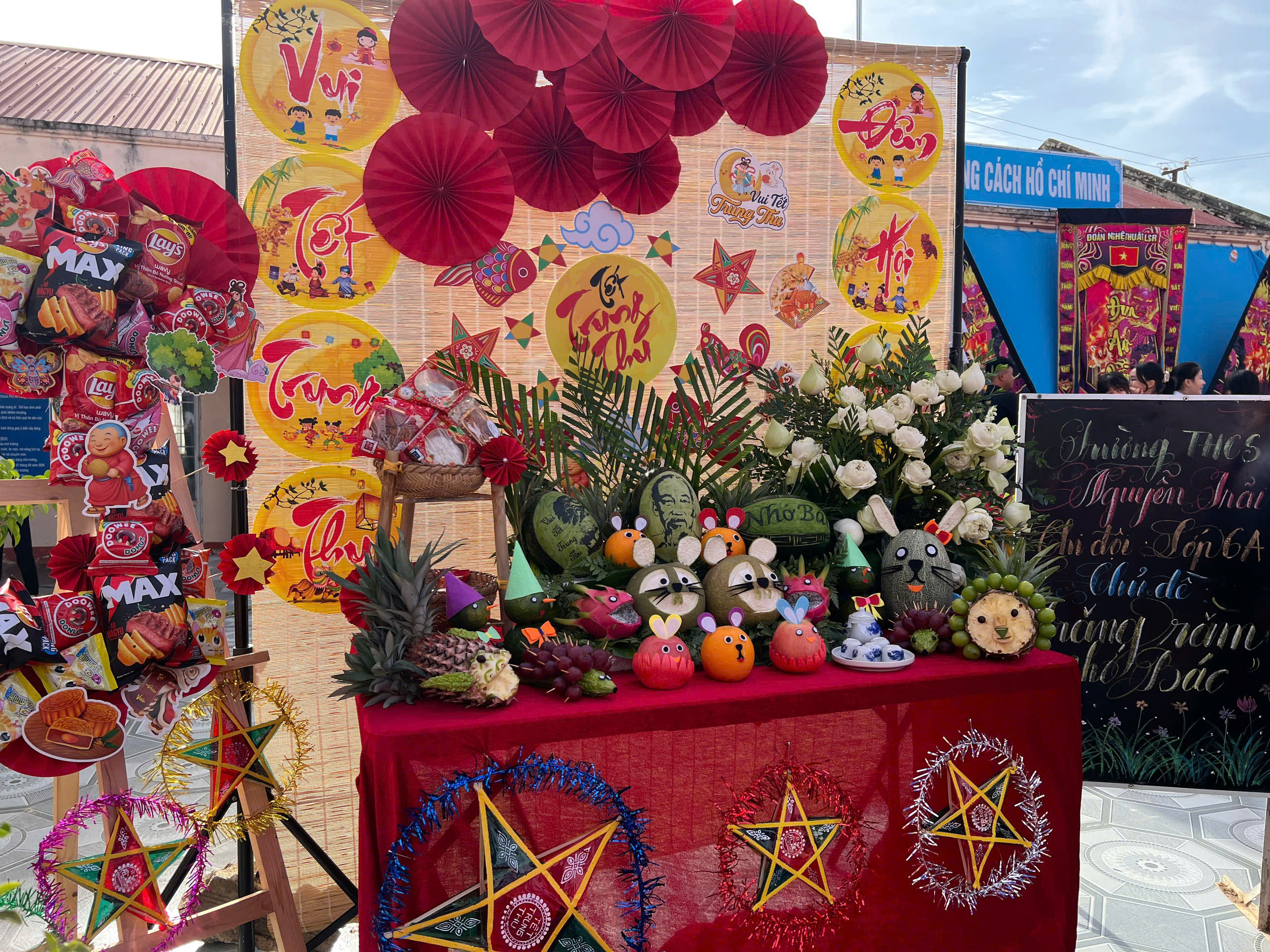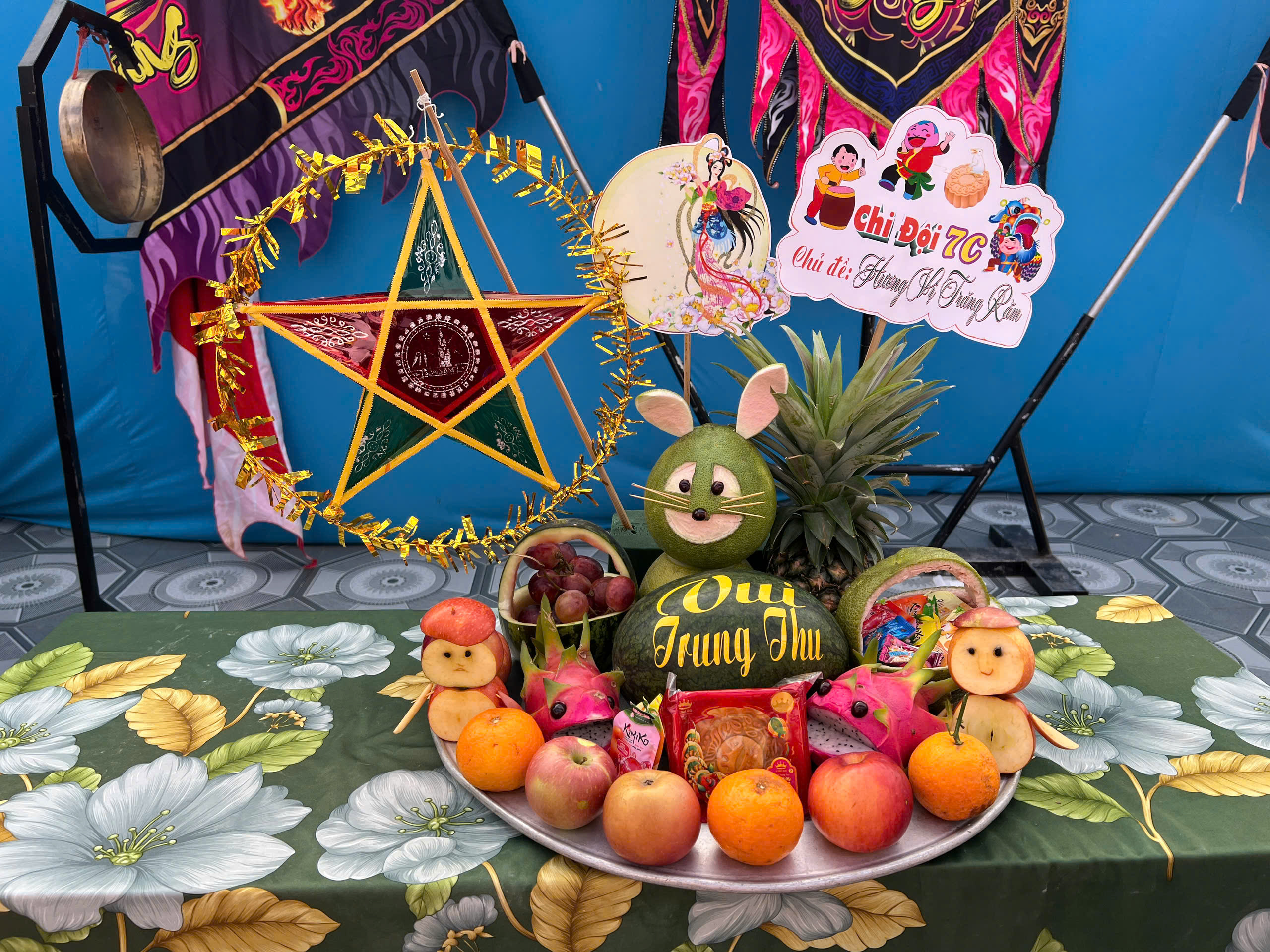 Điểm nhấn của ngày hội chính là cuộc thi trang trí mâm ngũ quả. Với sự khéo léo và óc sáng tạo không giới hạn, các lớp đã biến những loại hoa quả quen thuộc thành những tác phẩm nghệ thuật đầy màu sắc, mang đậm ý nghĩa truyền thống. Từ những chú chó bưởi ngộ nghĩnh, đàn thỏ con xinh xắn đến hình ảnh Vầng Trăng, Chú Cuội, Chị Hằng, tất cả đều thể hiện sự chuẩn bị công phu và tinh thần đồng đội cao.