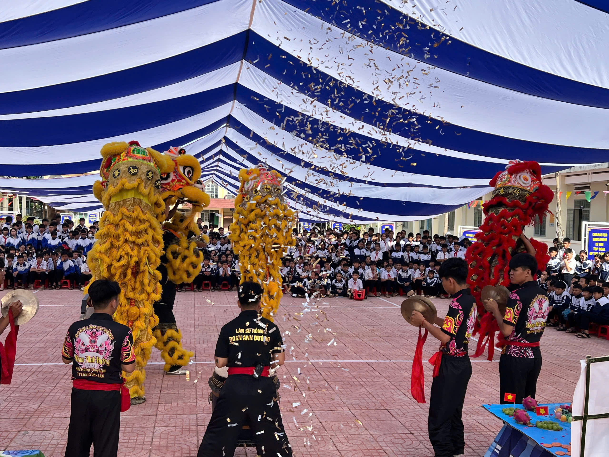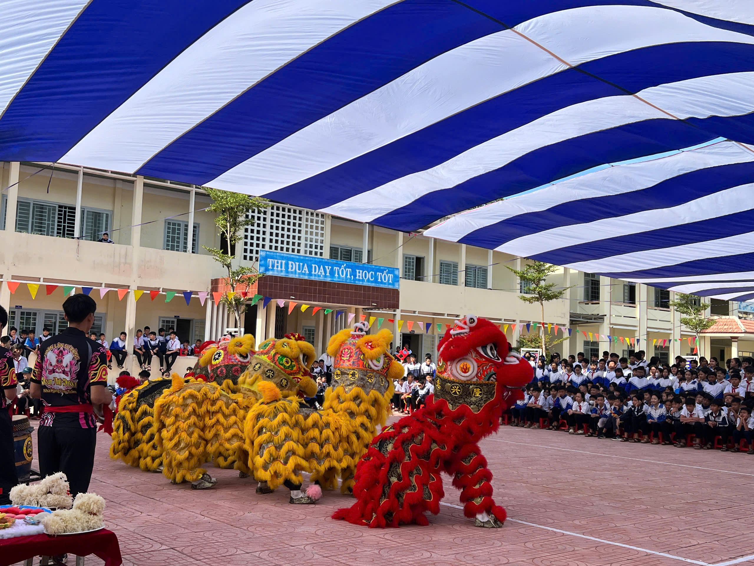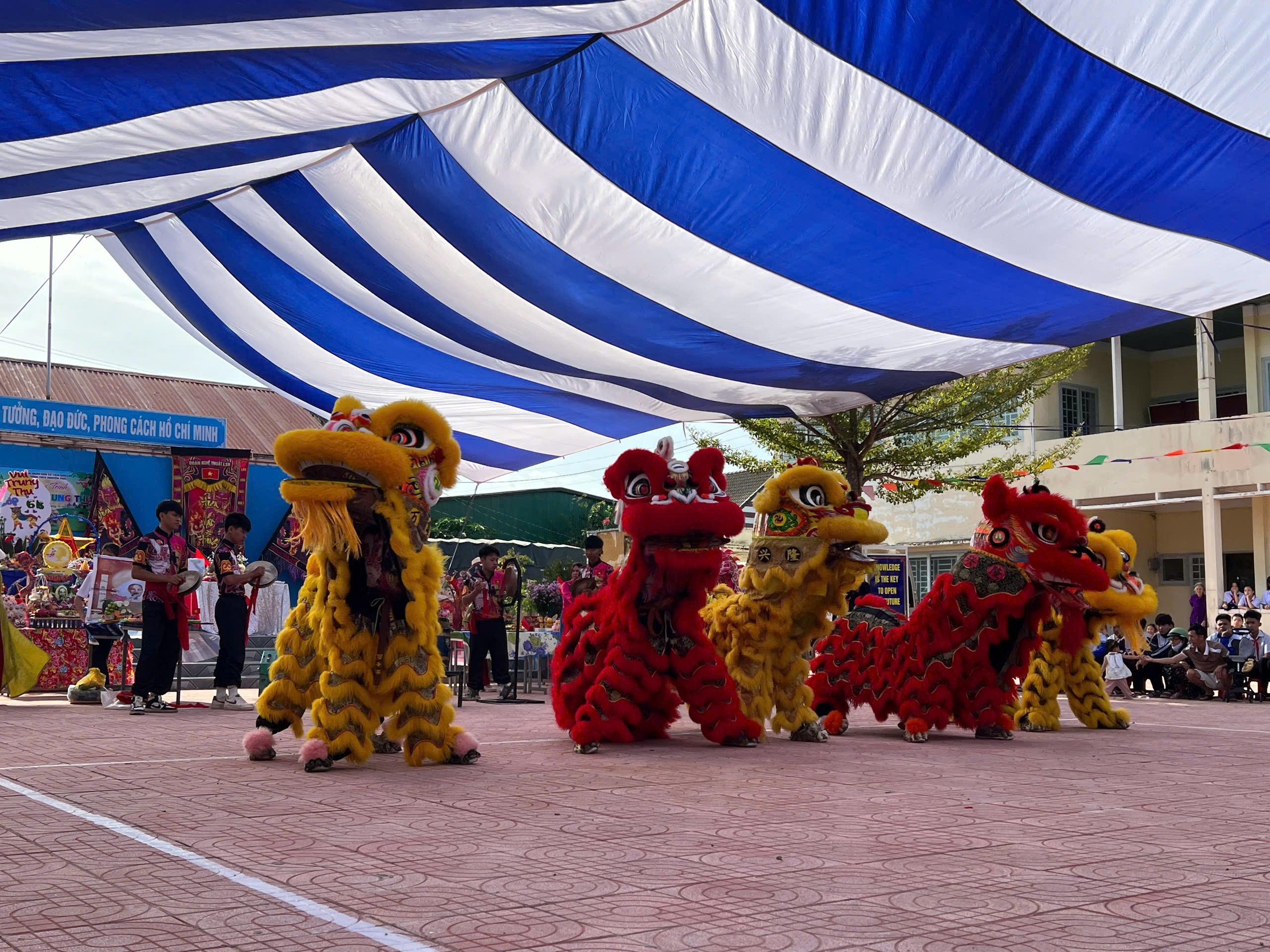 Mọi ánh mắt đều đổ dồn về sân trường khi tiếng trống rộn ràng vang lên, báo hiệu sự xuất hiện của đoàn múa lân sư rồng. Những bước nhảy dũng mãnh, những pha nhào lộn điệu nghệ cùng sự phối hợp nhịp nhàng giữa đội múa và tiếng trống đã tạo nên một màn trình diễn mãn nhãn, mang đến không khí tưng bừng và lời chúc tốt đẹp cho một năm học thành công.